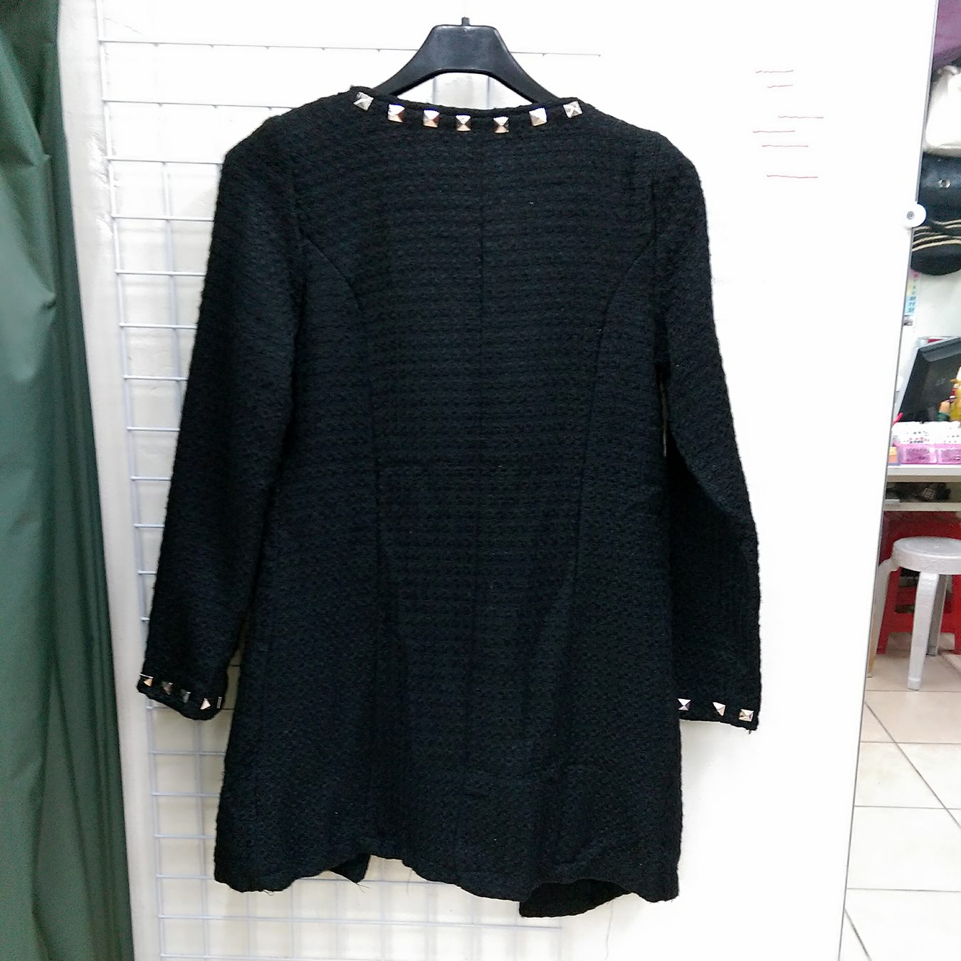9成新 外套 售價550 平放測量方法不同,可能存在2厘米左右的誤差 面料:毛料 顏色:黑色 彈性:無 其它輔件:無 尺寸:F 胸圍:42cm 肩寬:33cm 袖長:56cm 衣長:78cm